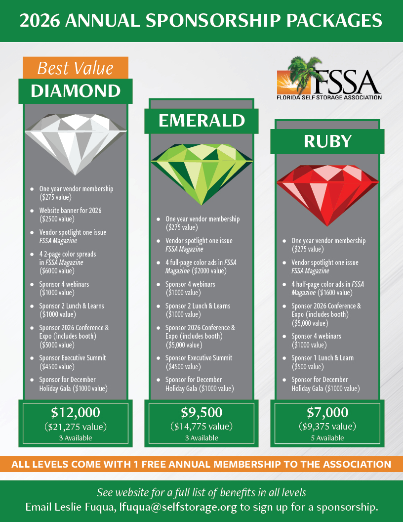 Email Leslie Fuqua, lfuqua@selfstorage.org to sign up for diamond, emerald or ruby sponsorship.